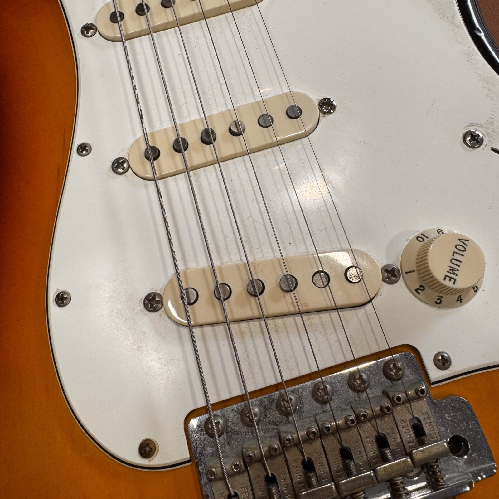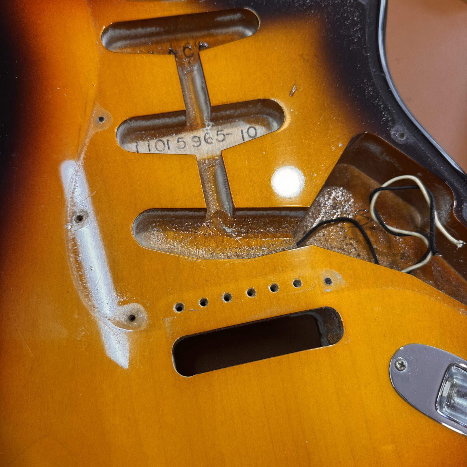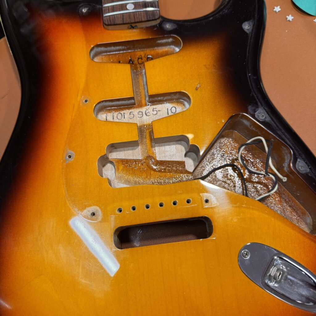 Fender Stratocasterをベースに、Joe Holmesスタイルを意識したカスタム改造のご依頼を2回にわたって承りました。リアハムバッカー化とフロイドローズブリッジへの交換という、プレイヤーのこだわりを反映した内容です。