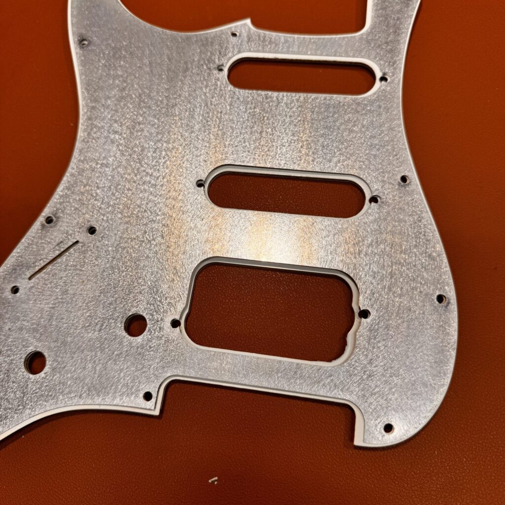 ピックガード取り付け 今回はリアのみボディ留め仕様。ピックガードの固定には工夫が必要で、取り付け角度やネジ位置に微調整を加えています。