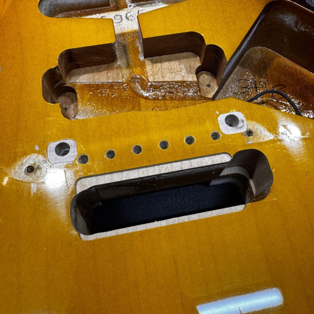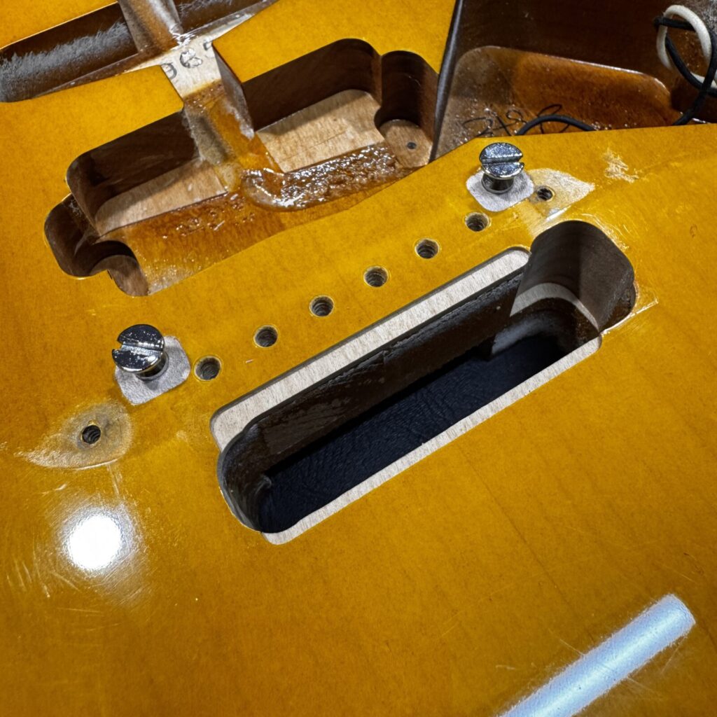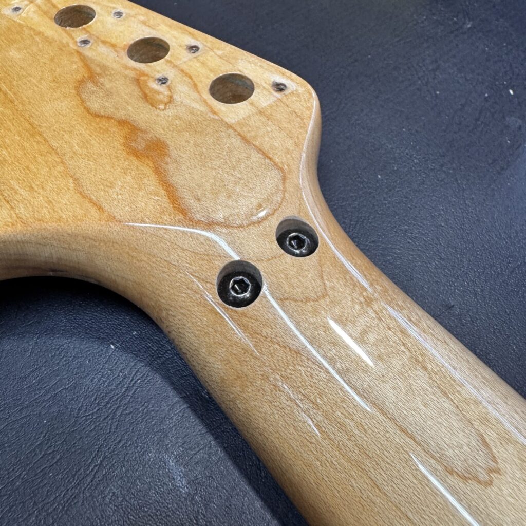Joe Holmesモデルではフロント・センターもボディ留めのようですが、今回はリアのみのため少しピックガードの取り付けに工夫が必要になりますね。