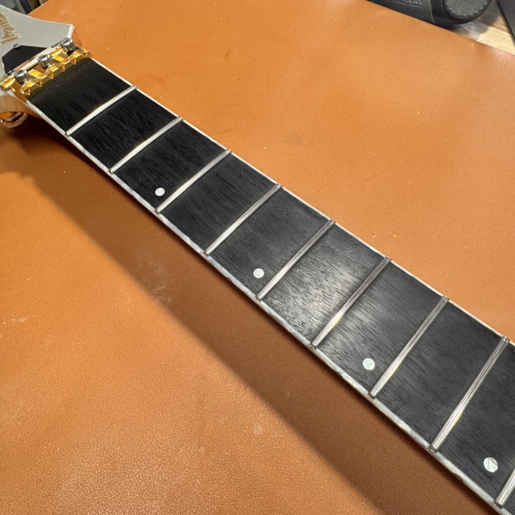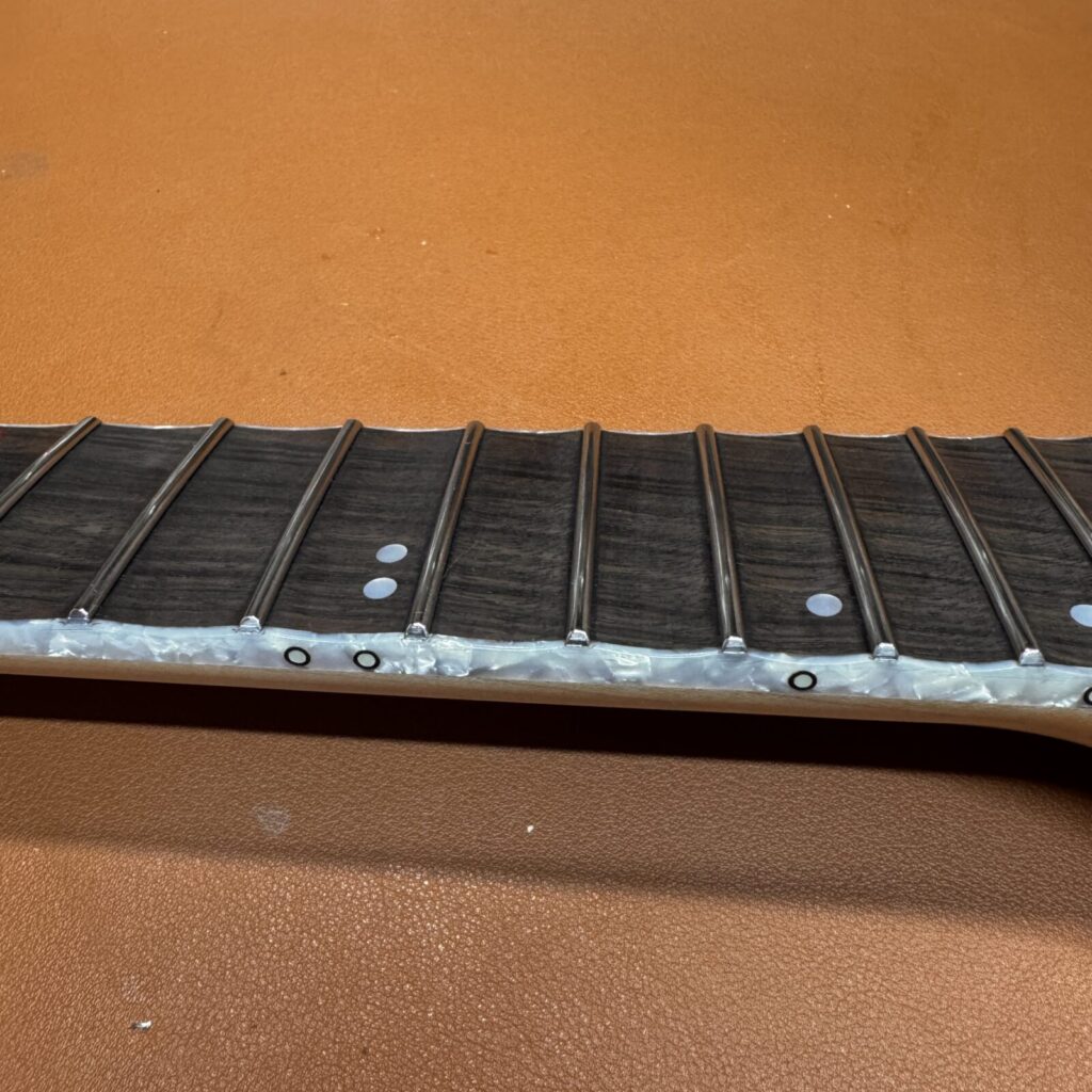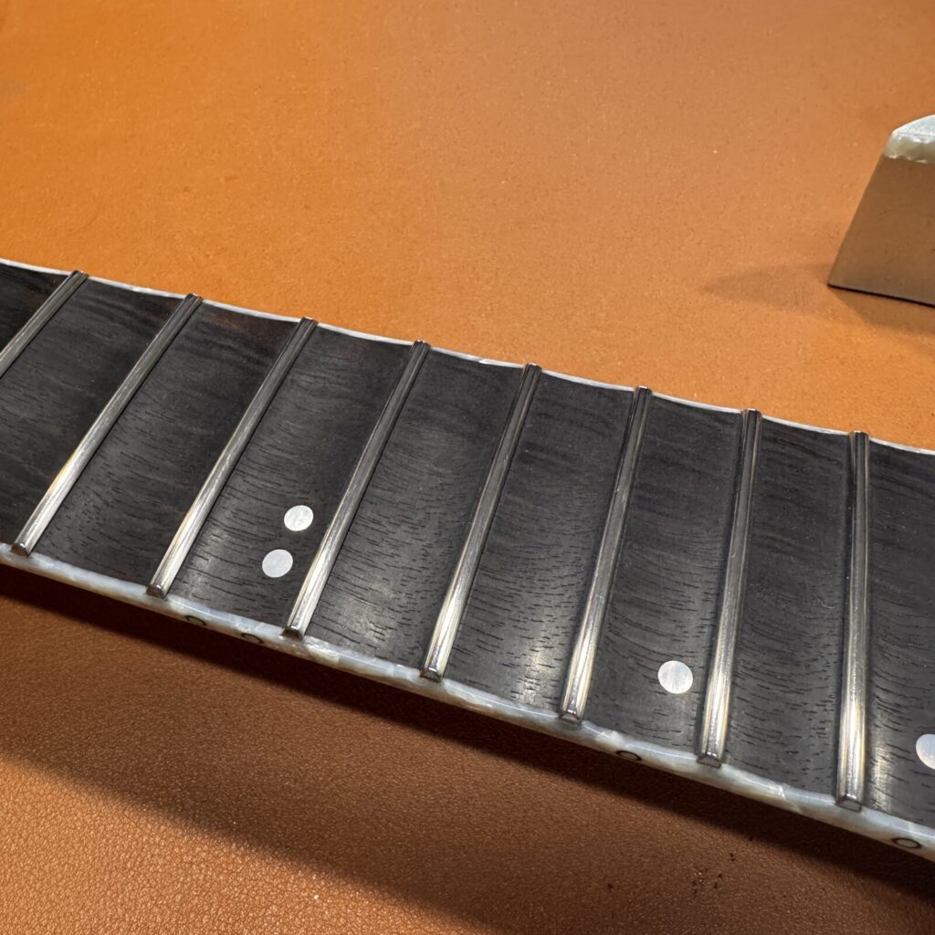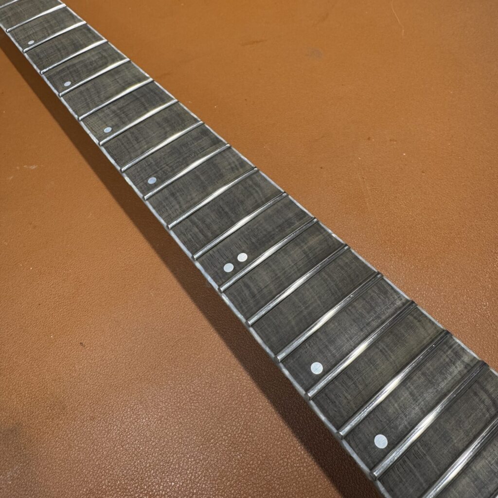 加工を進めていくと、黒く染色されていたローズウッドの下から、もとの木地の色が見えてきました。染色は指板材の個体差を均一化するために行われることがありますが、削り込みによって地色が現れるのは避けられないケースです。今回はお客様に確認いただき、そのまま仕上げる方針としました。。