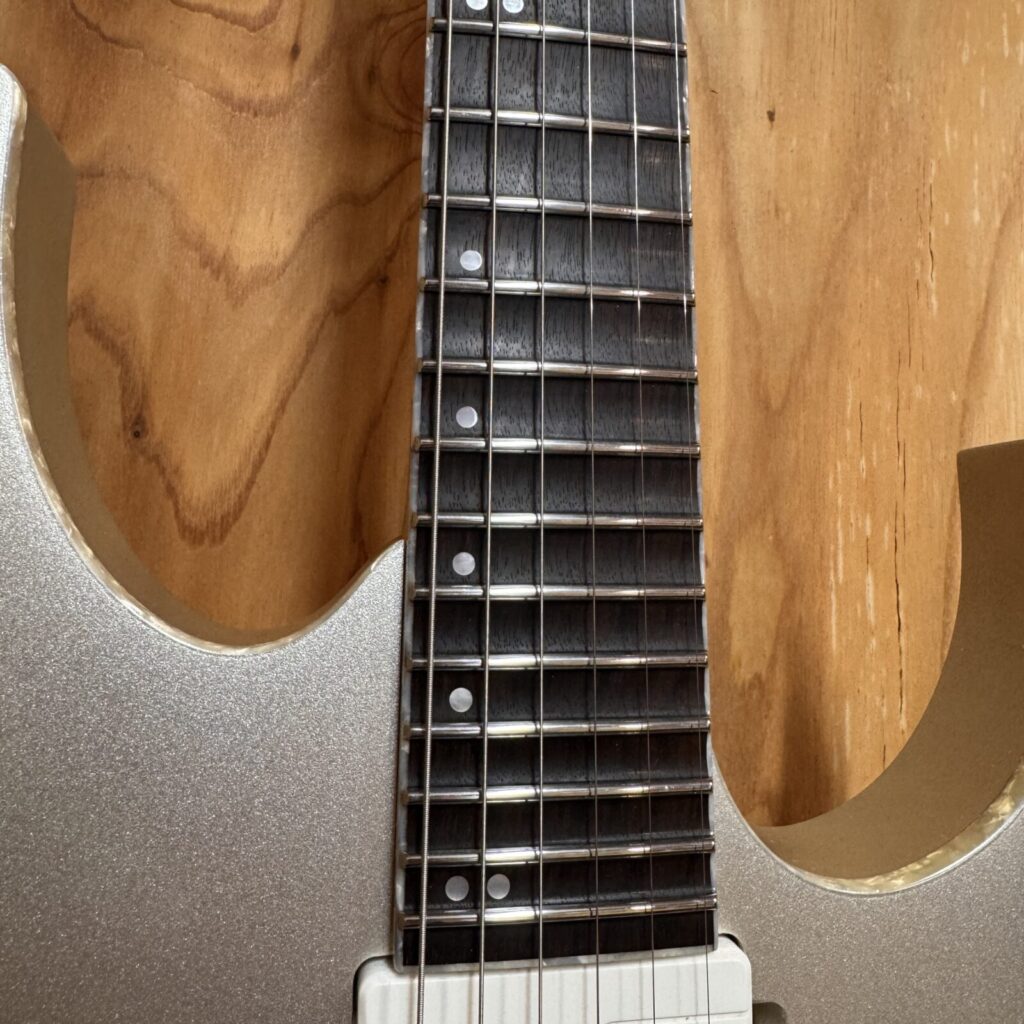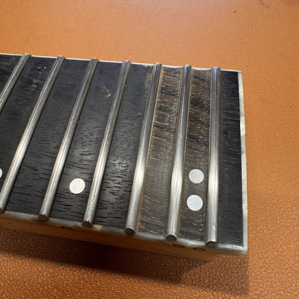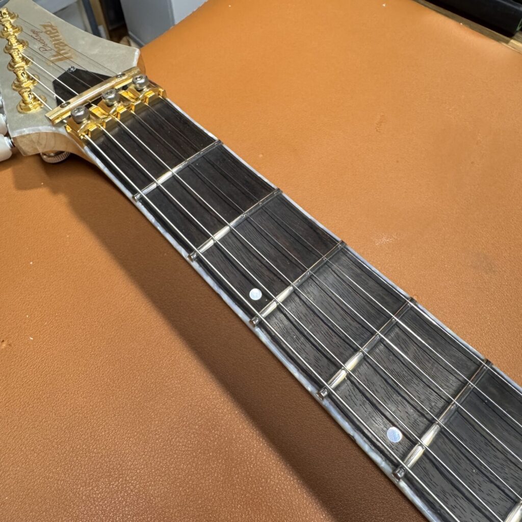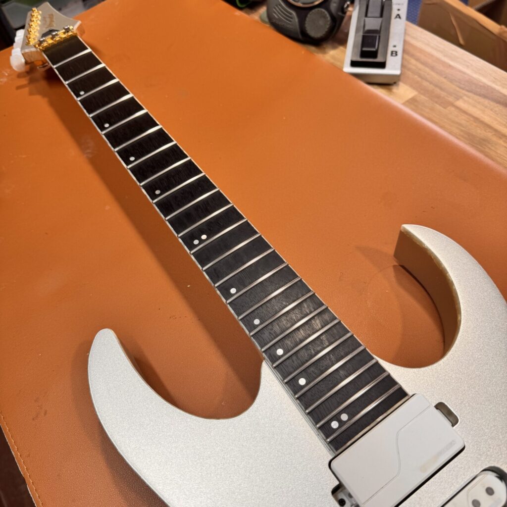 加工を進めていくと、黒く染色されていたローズウッドの下から、もとの木地の色が見えてきました。染色は指板材の個体差を均一化するために行われることがありますが、削り込みによって地色が現れるのは避けられないケースです。今回はお客様に確認いただき、そのまま仕上げる方針としました。。