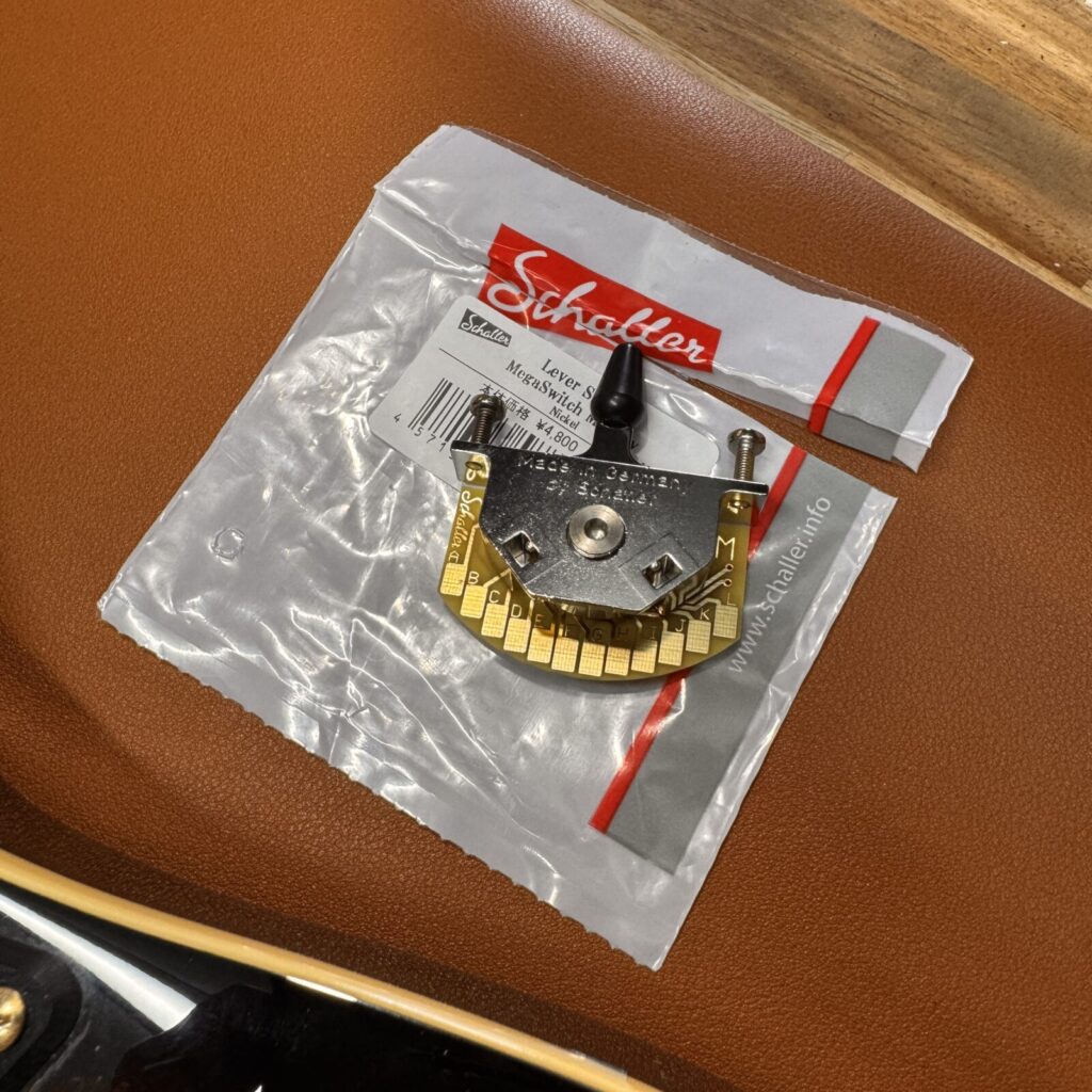 一般的なメガスイッチはテレキャスターのザグリに収めるのが難しいほど厚みがありますが、Schaller製は通常のレバースイッチとほぼ同サイズ。今回は無加工で交換可能でした。