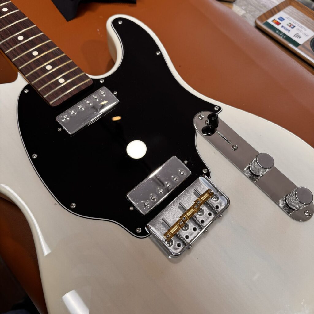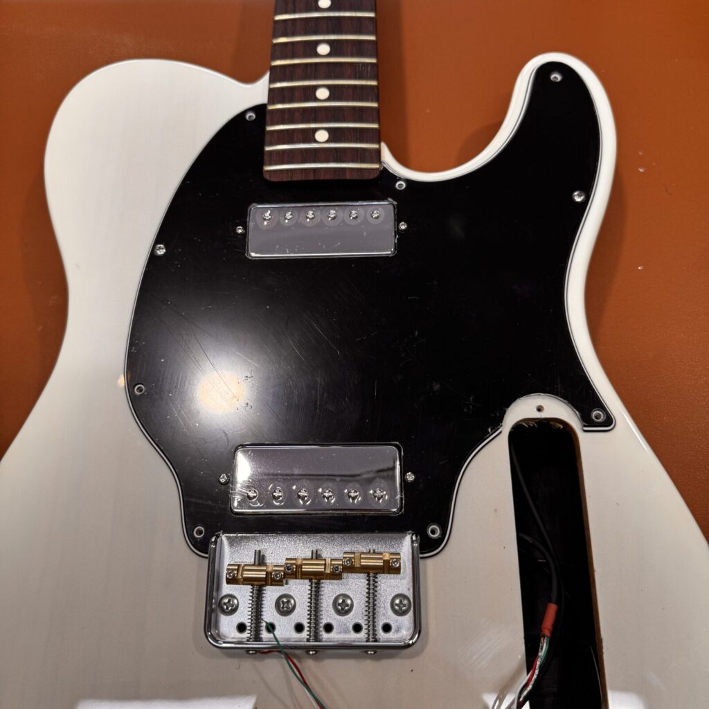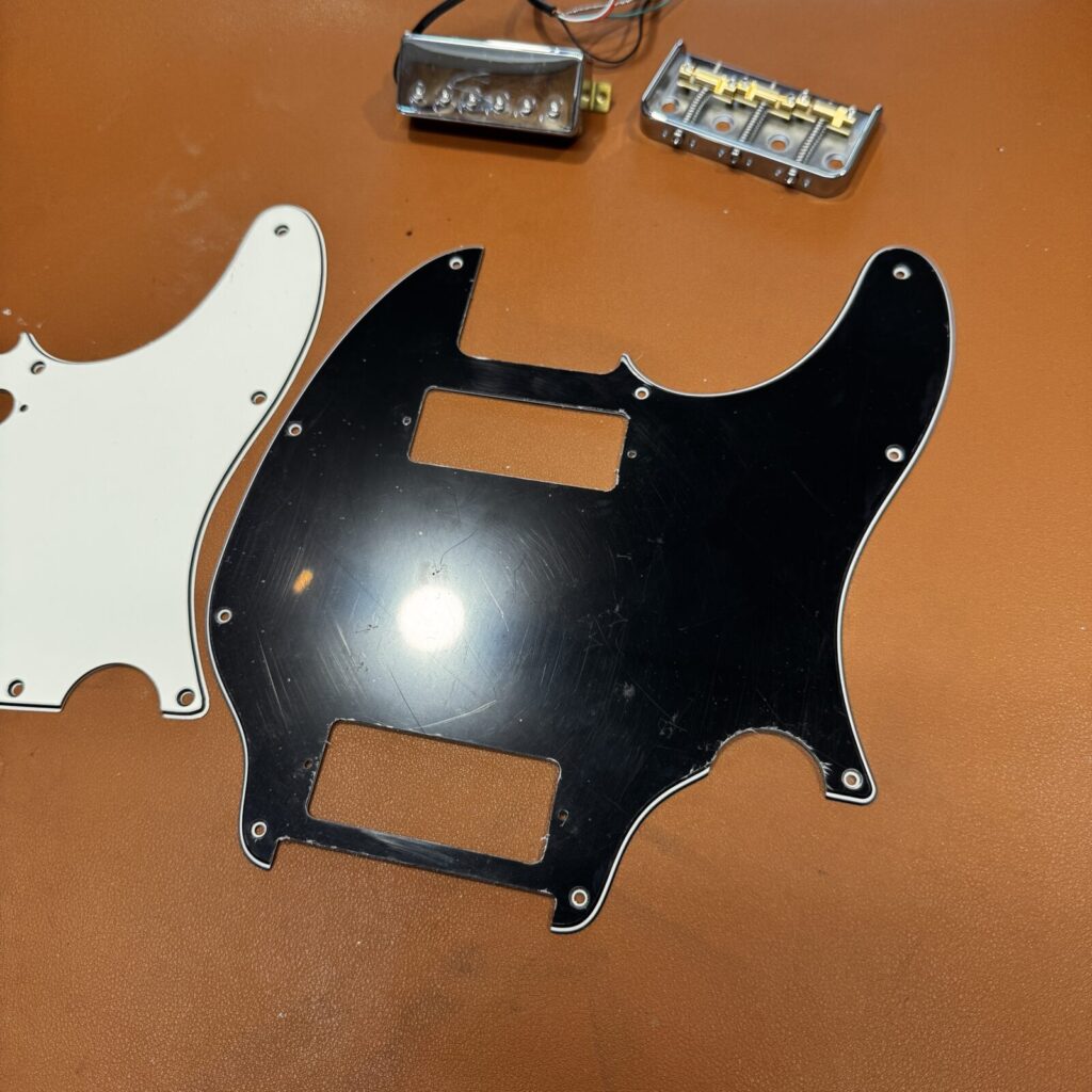 今回は、Fenderのテレキャスターに、ミニハムバッカーを2基搭載し、ブリッジをショートタイプへ交換する改造を行いました。パーツは一部取り外した状態での持ち込み。
