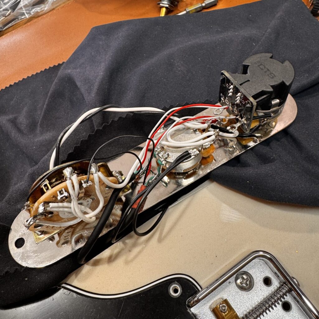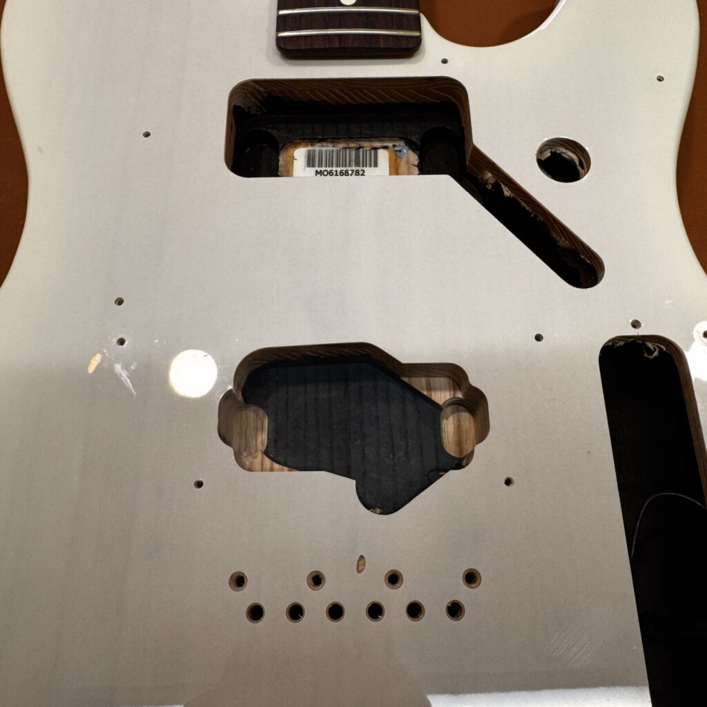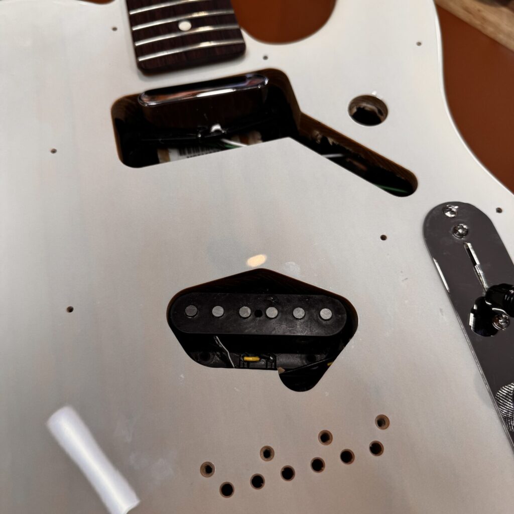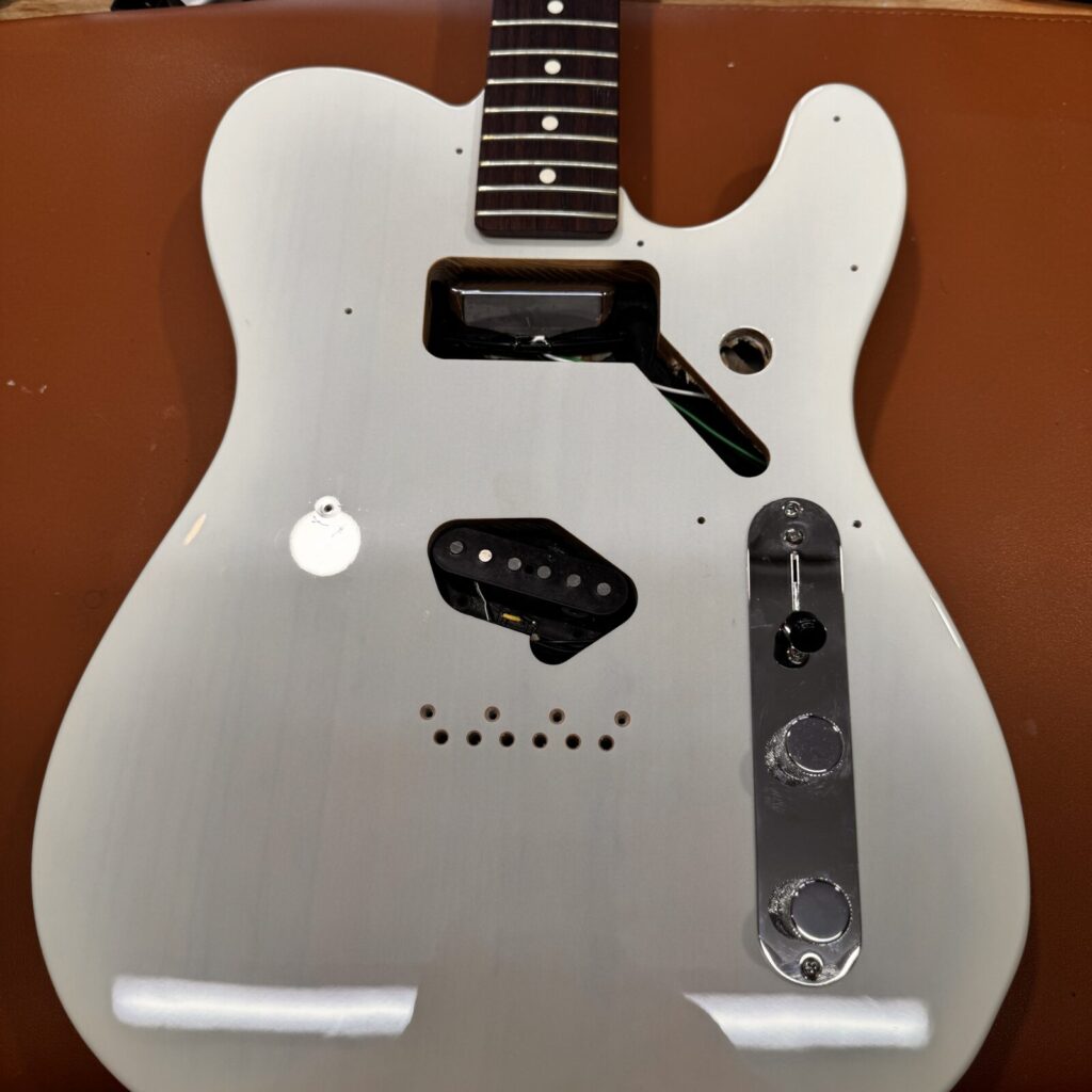 今回は、Fenderのテレキャスターに、ミニハムバッカーを2基搭載し、ブリッジをショートタイプへ交換する改造を行いました。パーツは一部取り外した状態での持ち込み。