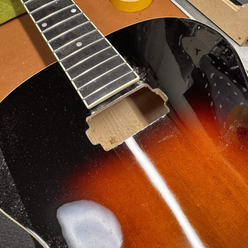 最後に、ピックガードをピックアップの形状に合わせて切り欠き加工。